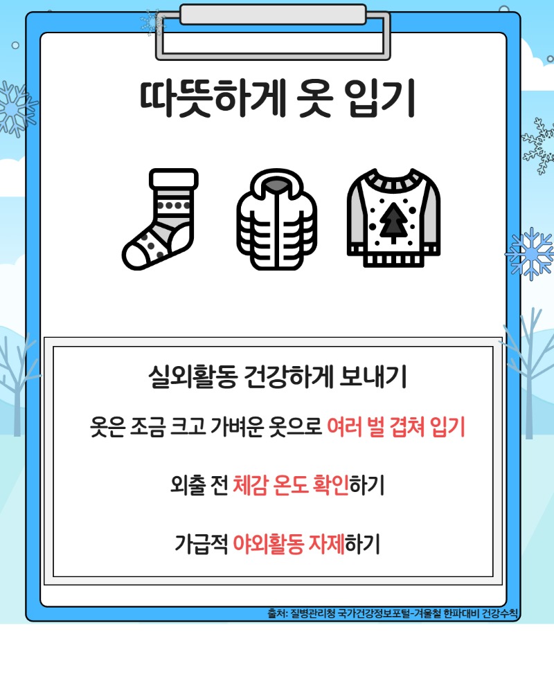 추운 겨울철 한파를 대비하기 위한 건강 수칙에 대해 전달드립니다!