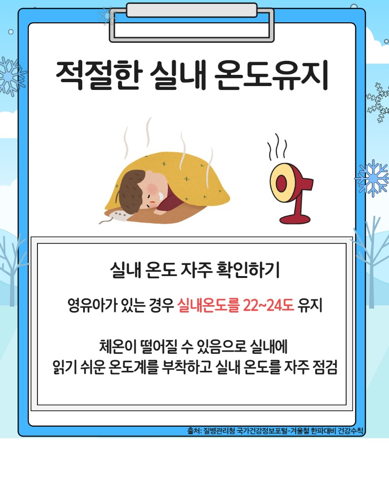 영유아가 있는 가정의 경우에는 실내 적정 온도(22~24도)를 유지해야합니다. 영유아의 경우 성인과 달리 체온을 쉽게 잃을 수 있고, 체온을 충분히 올릴 수 없기 때문입니다.