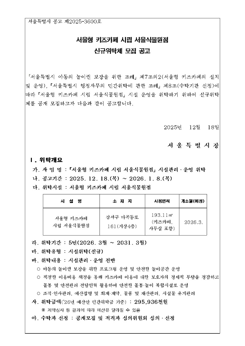 서울형 키즈카페 시립 서울식물원점 신규위탁체 모집 공고